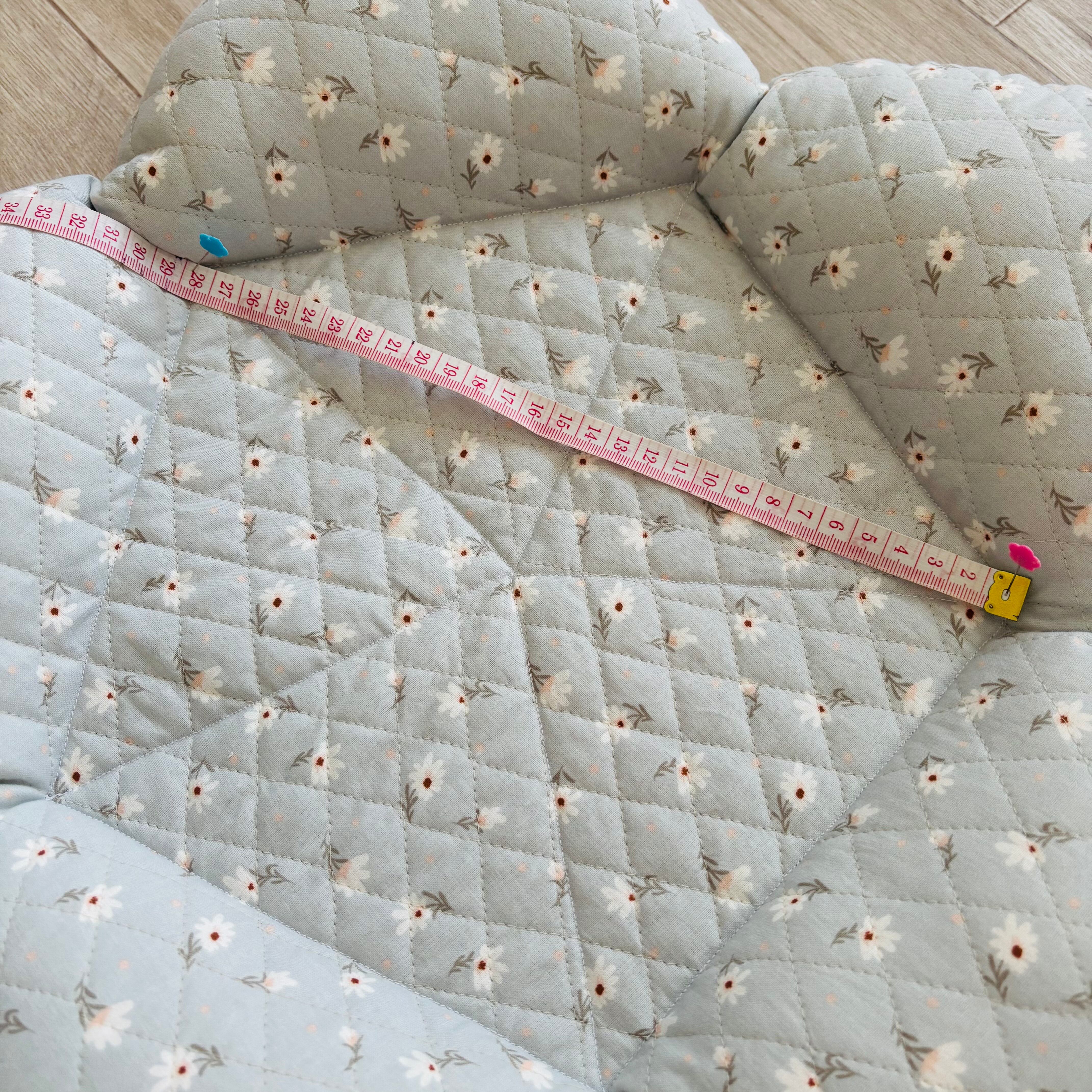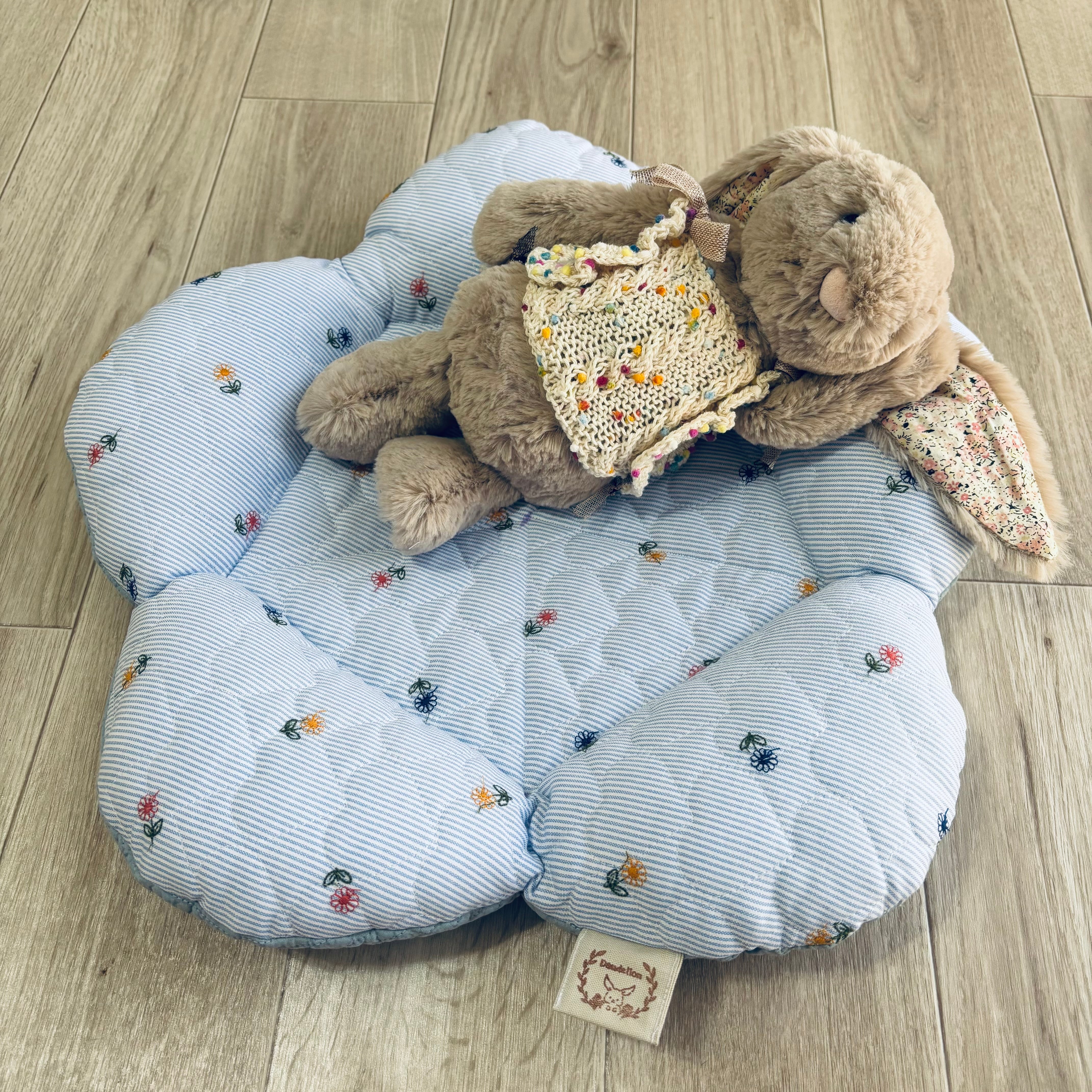 可愛い柄のキルト布にヌビキルトを組み合わせております。爽やかボーダーマリンにお花の刺繍が入ってて可愛いです♡