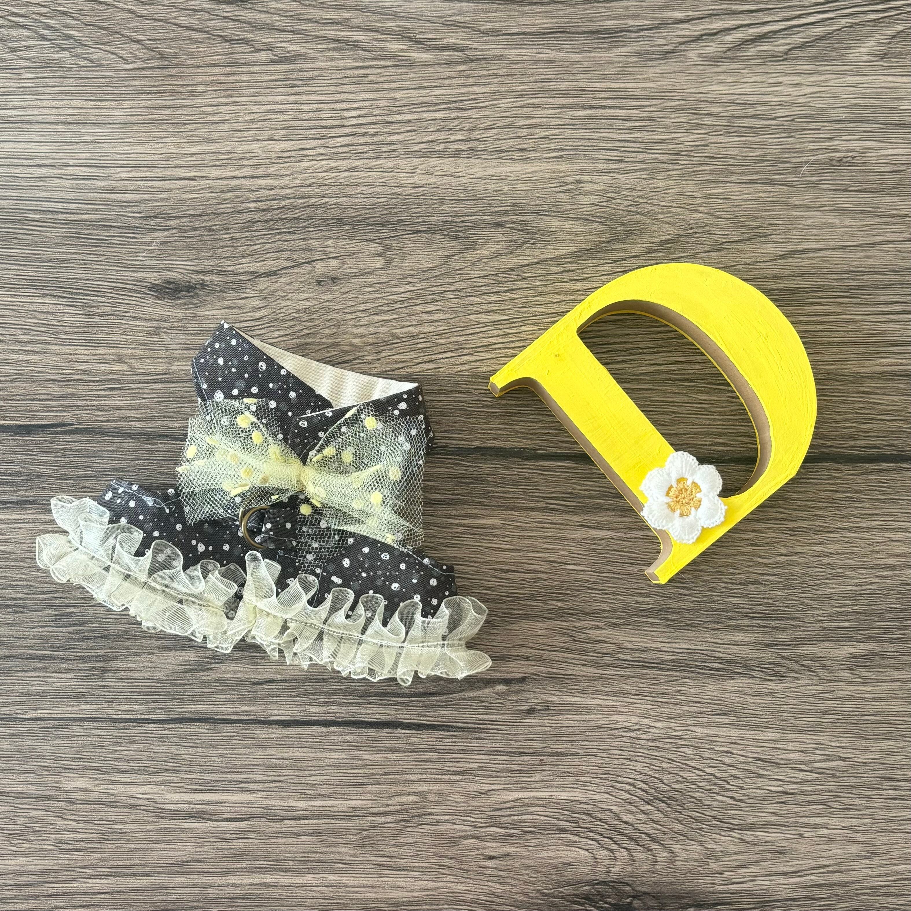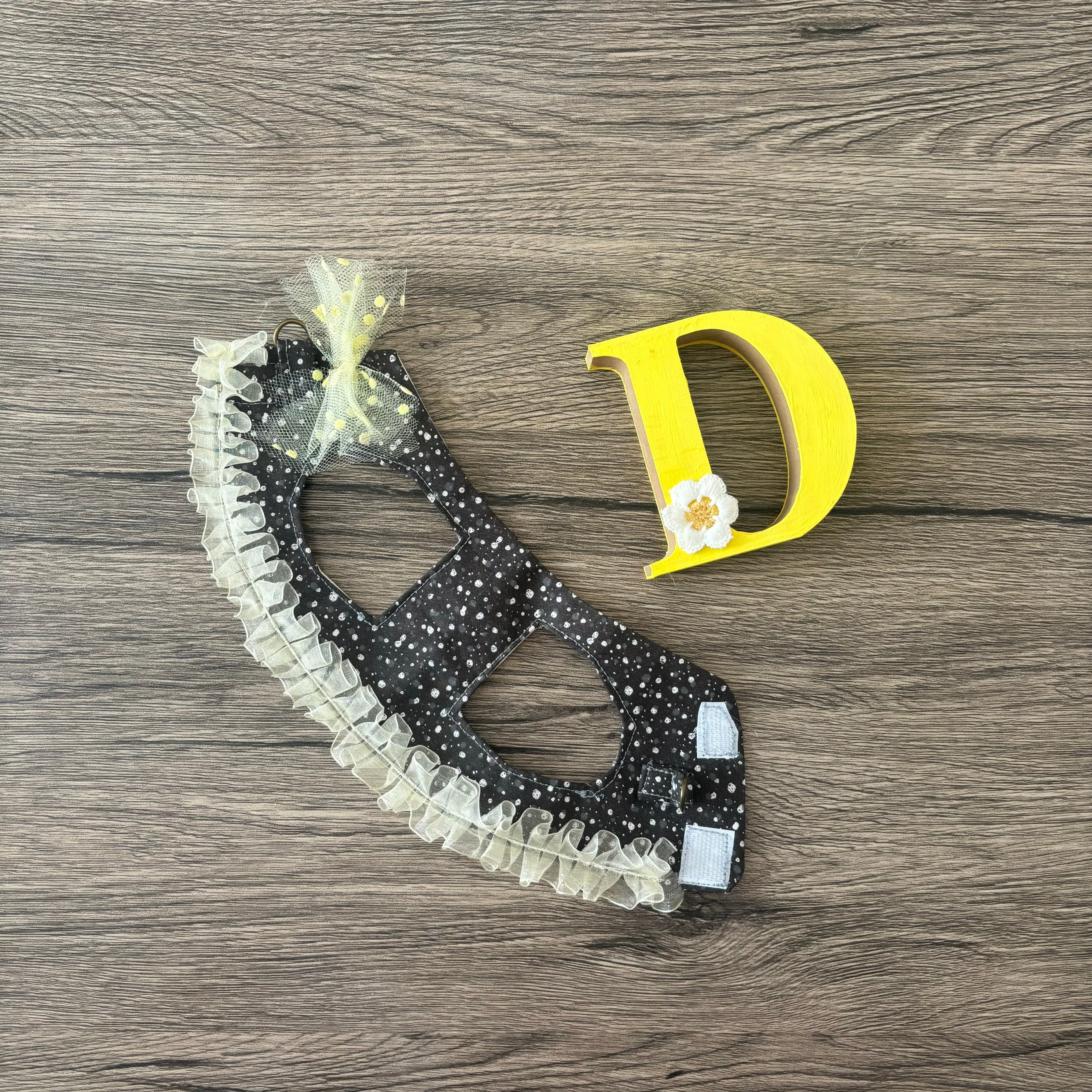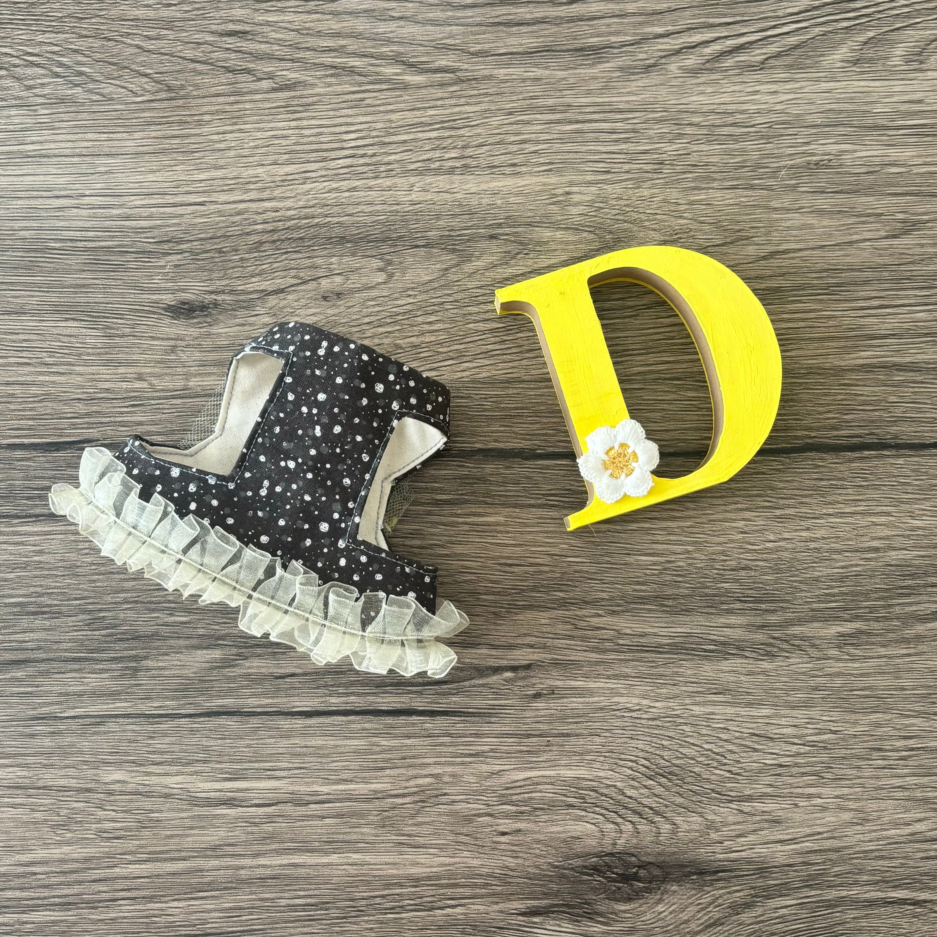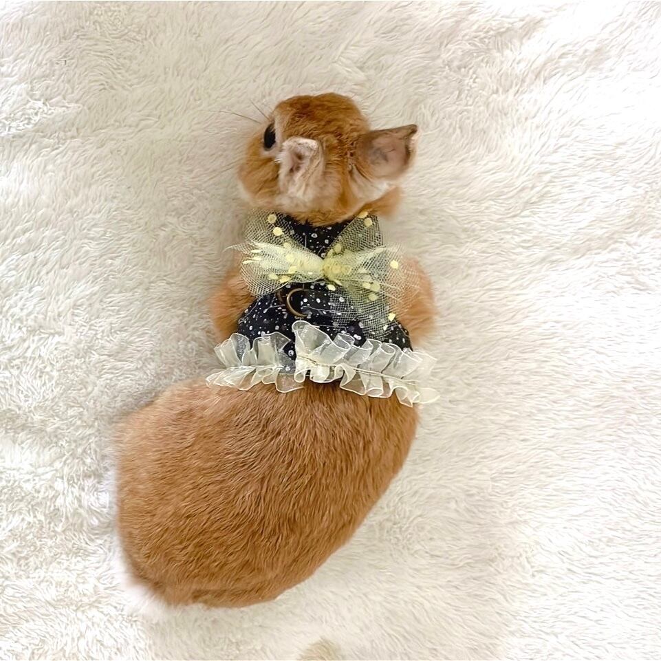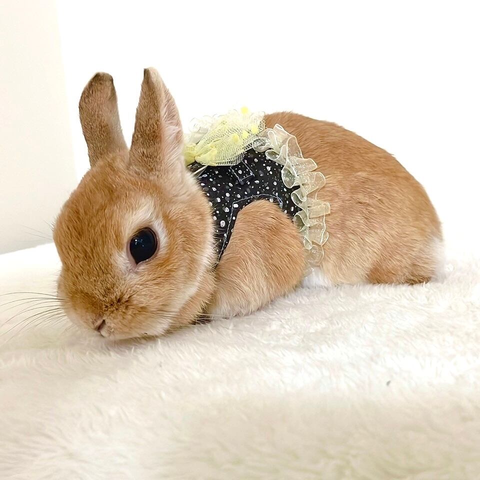 濃い目のグレーに水玉模様の生地使って作成したうさぎさん用のお洋服ハーネスになります❁⃘*.゚